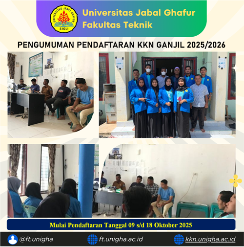 Panitia Pelaksana Kuliah Kerja Nyata (KKN) Universitas Jabal Ghafur dengan ini mengumumkan bahwa Pendaftaran KKN Semester Ganjil 2025/2026 mulai dari tanggal 09 s/d 18 Oktober 2025. Bagi mahasiswa yang mengambil Mata Kuliah KKN di KRS, untuk dapat mendaftarkan diri secara online melalui website : kkn.unigha.ac.id.